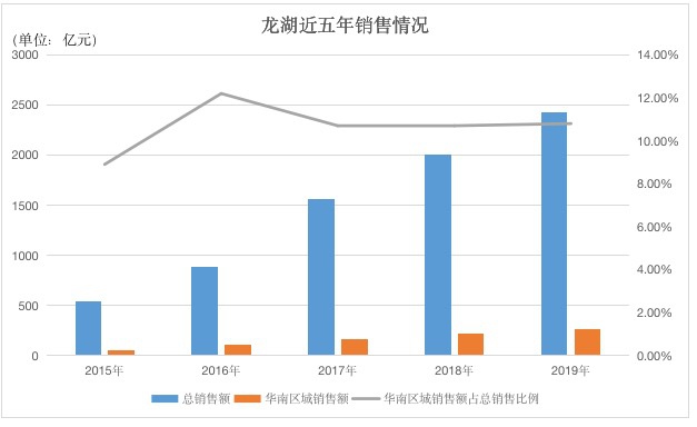 数据显示,2019年全年,龙湖集团合同销售金额2425亿元,销售面积1424万平方米,而其华南区域销售额为263亿元,占总销售额10.8%,在五大区域中排名第四。
