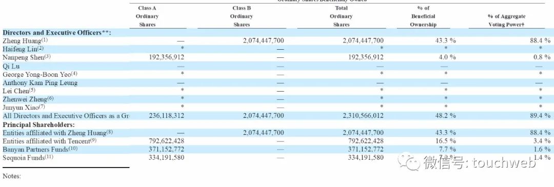 其中,黄峥持股为43.3%,拥有88.4%的投票权;腾讯持股为16.5%,拥有3.4%的投票权;