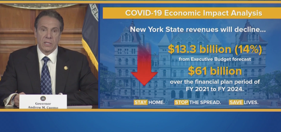 新浪财经讯 美国东部时间4月24日,纽约州州长库默(Cuomo)在最新召开的新闻简报上对纽约州经济作出汇报。他表示,由于新冠肺炎疫情在纽约州的流行,根据目前测算,纽约州财政收入较此前预测将减少133亿美元,占全年财政收入预测的14%,这意味着未来几周在学校、地方政府和医院等领域的支出可能会被削减。