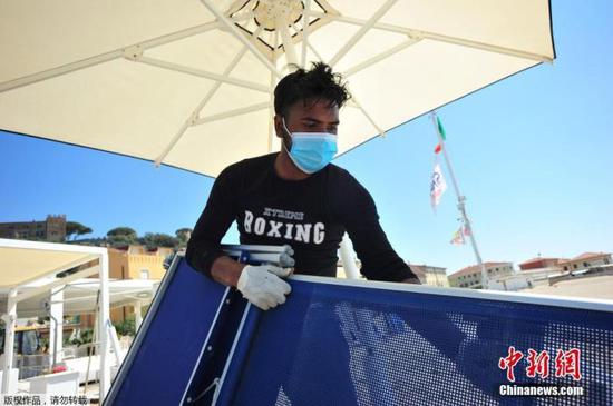 当地时间4月24日,意大利一海滩俱乐部的工人戴着口罩和手套为度假区的重新开业做准备。意大利总理孔特表示,从5月4日开始,该国将正式进入抗疫第二阶段,重启全国经济。