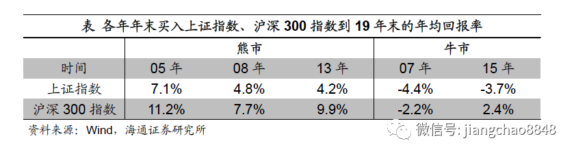 例如05年、08年和13年都是著名的大熊市,05年上证指数曾跌破1000点,08年和13年曾跌破2000点,但如果在这三年的年末买入上证指数,并且持有到2019年末卖出,年化回报率分别为7%、5%和4%,依然是可以赚钱的。如果买的是质量更好的沪深300指数,同期的年化回报率分别为11.2%、7.7%和9.9%,其实并不逊色于房市。