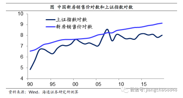 我们选择统计局公布的全国商品房销售均价来代表房价,选择上证指数来代表股价,并且选择1990年以来的数据来进行观察。