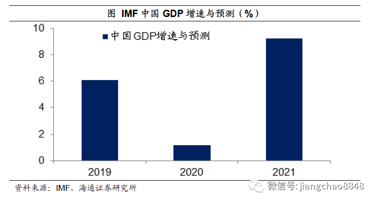 展望未来,疫情的影响将逐渐减弱,经济增速的下滑只是短期现象。根据IMF的预测,2020年中国经济增速为1.2%,而2021年将达到9.2%,也就是平均每年的增速依然在5%左右。再考虑每年2-3%左右的通胀率,未来两年的GDP名义增速均值仍有望达到7%左右。