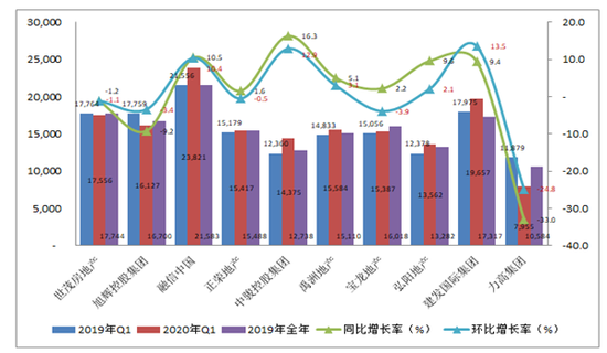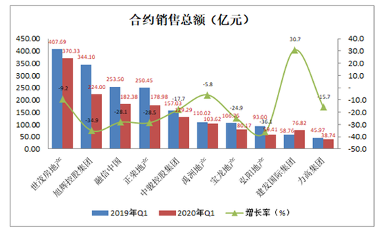 2020年第一季度,合约销售总额超过100亿人民币的主要有:世茂房地产(00813.HK)、旭辉控股集团(00884.HK)、融信中国(03301.HK)、正荣地产(06158.HK)、中骏控股集团(01966.HK)、禹州地产(01628.HK)、宝龙地产(01238.HK)。