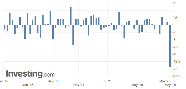 制造业和服务业进一步陷入萎缩,美国4月Markit制造业采购经理人指数PMI报36.9,创近11年新低,服务业采购经理人指数PMI报27.0,综合采购经理人指数PMI报27.4,环比均大幅下滑。需求受到打压,3月份耐用品订单下降14.4%,这已经超过了2008年金融危机期间的最大降幅;汽车制造商受到严重打击,订单暴跌18.4%,创下1998年以来最差表现,对于工作岗位的担忧令消费者推迟购车计划。