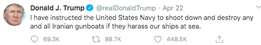 对于伊朗的新动向,美国总统特朗普在推特上表示:“我已经指示美国海军,只要伊朗在海上骚扰我们的舰船,就击毁所有伊朗炮舰。”