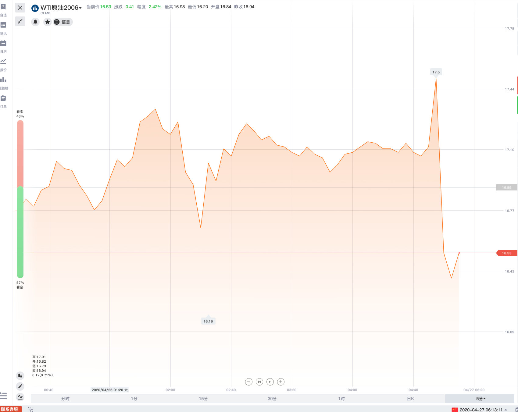 周一(4月27日),据路透报价,WTI原油期货开盘后跌幅扩大,截止06:10,跌幅扩大至3.32%,报16.60美元/桶。