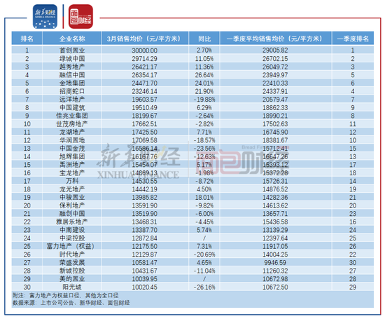 3月销售均价超过20000元/平方米的房企还包括越秀地产、融信中国、金地集团以及招商蛇口,分别为26421.17元/平方米、26354.17元/平方米、24471.7元/平方米和23246.14元/平方米。值得一提的是,TOP30房企3月销售均价均超过了10000元/平方米。