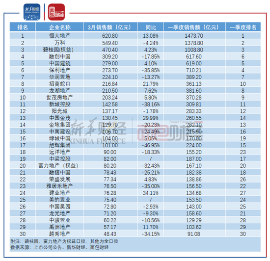 恒大地产3月实现销售额620.8亿元,3月销售面积为694.5万平方米,均位列TOP30房企首位。
