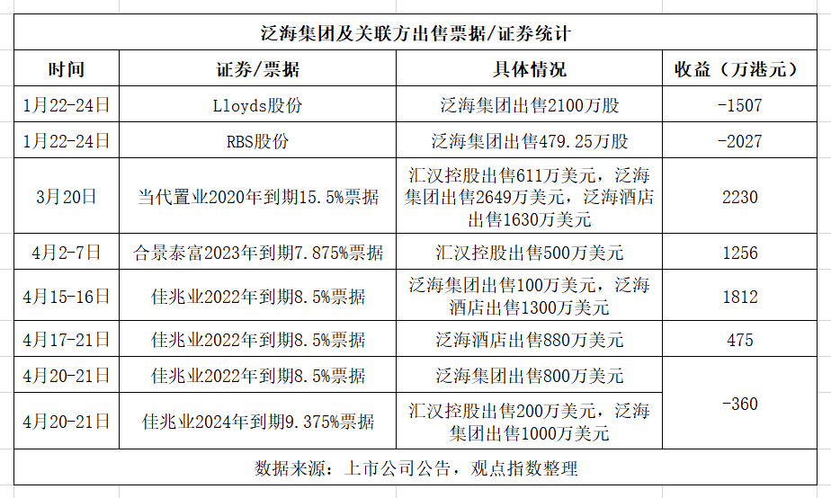 在更早之前的4月初,“泛海系”还透过汇汉控股出售面值500万美元的合景泰富2023年到期7.875%票据,实现收益约1256万港元。