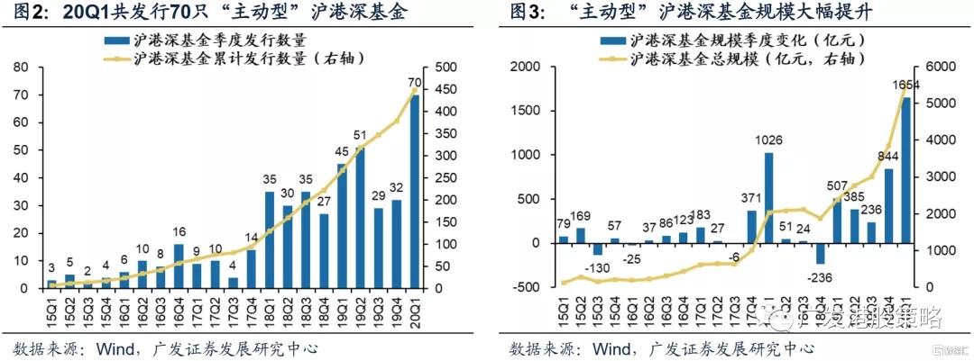 20Q1新发行「主动偏股型+灵活配置型」沪港深基金70只,创互联互通以来最高纪录。规模方面,尽管Q1港股出现回撤,但沪港深基金规模逆势提升超1600亿元。