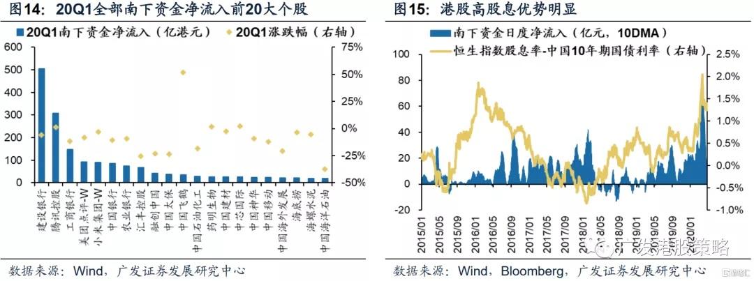 但如果把统计口径扩展到全部南下资金,与主动偏股型基金Q1减仓港股银行股不同,南下资金20Q1前10大净流入个股中,有5只银行股(图14),其中南下资金对建设银行的净买入金额超500亿港元。