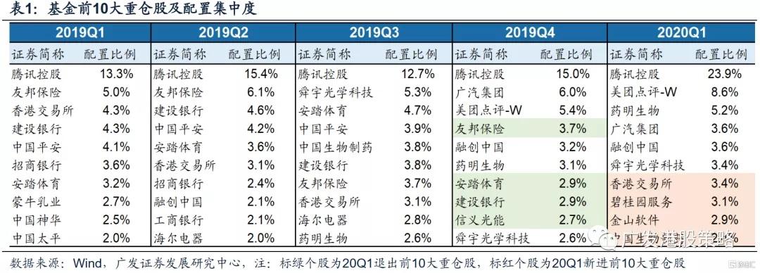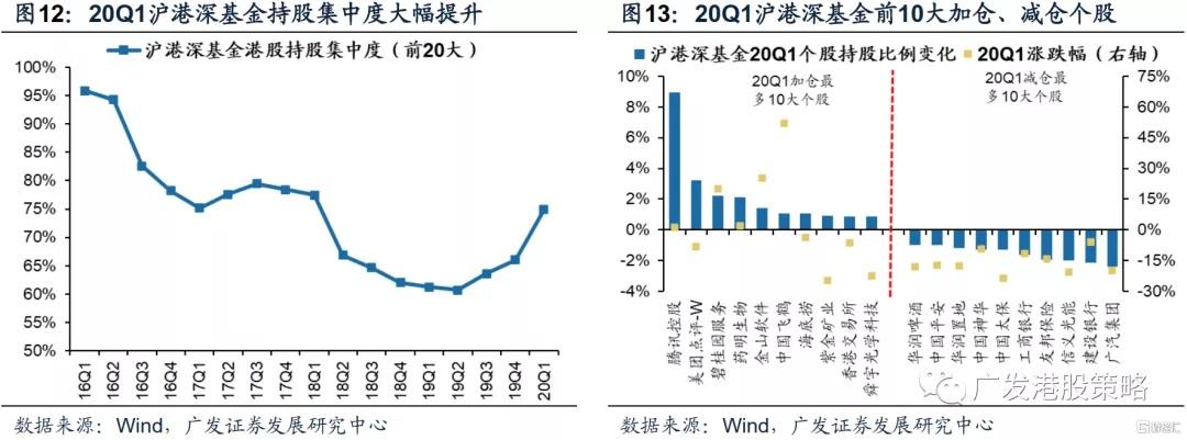从个股持股占比变化看,沪港深基金20Q1前三大加仓个股分别为腾讯控股、美团点评-W、碧桂园服务,减仓幅度较大的个股包括广汽集团、建设银行、信义光能等。