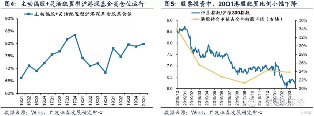 沪港深基金高仓位运行,港股配置比例小幅下降。沪港深基金20Q1股票配置比例由19Q4的78.8%小幅上升至79.9%。AH市场选择上,AH市场相对走势影响沪港深基金配置偏好,受新冠肺炎疫情先后在国内与海外爆发影响,兼具「在岸」与「离岸」属性的港股Q1明显跑输A股,沪港深基金港股配置比例小幅下降。
