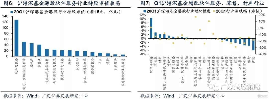 软件服务仍是沪港深基金港股第一重仓行业,且20Q1进一步加仓。截至20Q1,沪港深基金港股持股市值最高的行业是软件服务,持股市值达128.2亿元,其次为医药、房地产。