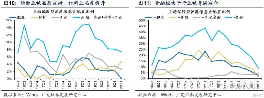 周期:整体降仓,但材料业受关注度较高。受油价暴跌影响,沪港深基金对港股能源行业的配置已降至16Q3以来最低位。但与此同时,材料行业持股占比在20Q1大幅提升至4.6%,创历史新高,进一步细分行业分析,受青睐的材料子行业主要包括有色金属、水泥等;