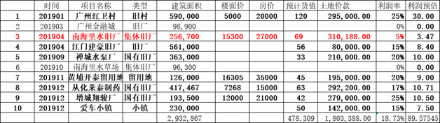 19年转化了十个项目,详见上表。公司纳入土储的八个项目的货值我自己估算大概接近五百亿左右。这些项目中像红卫村、水泵厂、开泰、莱泰、翔骏、爱车小镇这几个项目利润率应该都是非常好的。里水旧厂项目利润应该就不好,最多是微利。