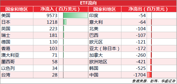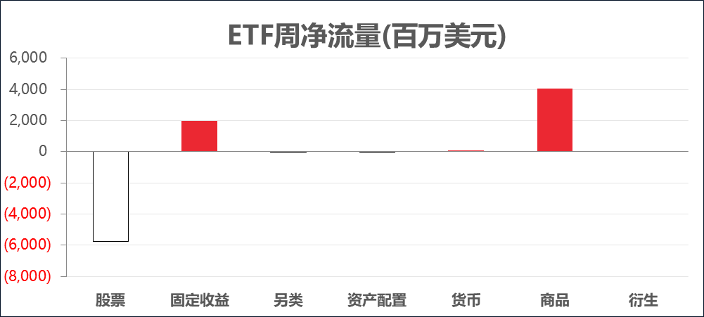 上周股票类ETF资金呈现流出状态,是近几周来首次,商品却继续保持大幅流入,流入超过40亿美元。