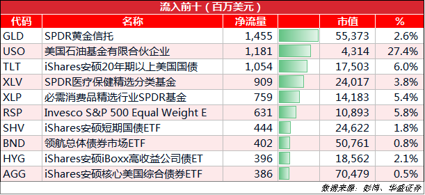 商品类ETF罕见霸占了流入前二的位置,其中黄金持续受捧,上周再流入近15亿美元位列榜首,反映了美联储大规模放水下资金的保值需求。