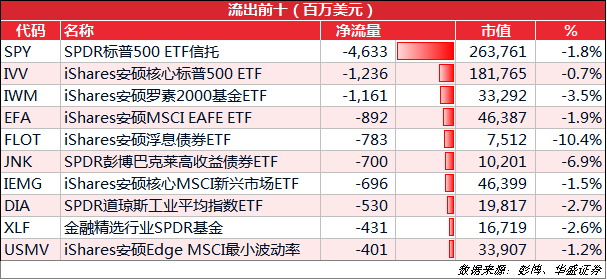 流出前十榜单里,前2名都是追踪标普500相关指数的ETF,一方面也是因为这两个ETF规模足够大的缘故。