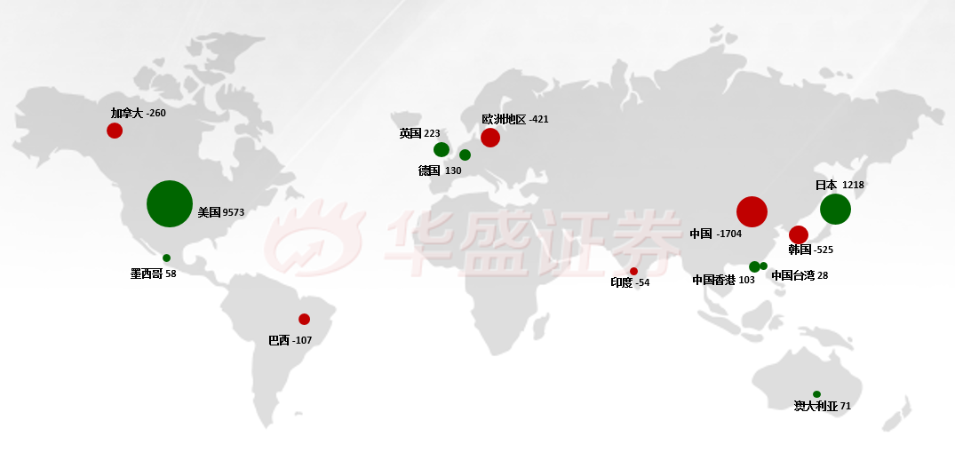 按国家和地区区分,美国和日本依然稳坐前2位,其中美国市场资金流入平稳,保持在96亿美金的水平,未有大幅减少或增加。