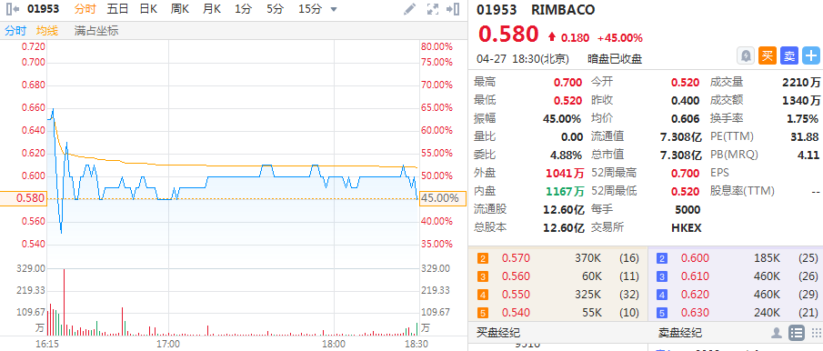 华盛资讯4月27日讯,马来西亚楼宇承包商Rimbaco Group暗盘收涨45.00%,报价0.58港元,不计手续费一手可赚900港元,最新成交额1340万港元,总市值7.308亿港元,该股将于明日正式挂牌港交所。
