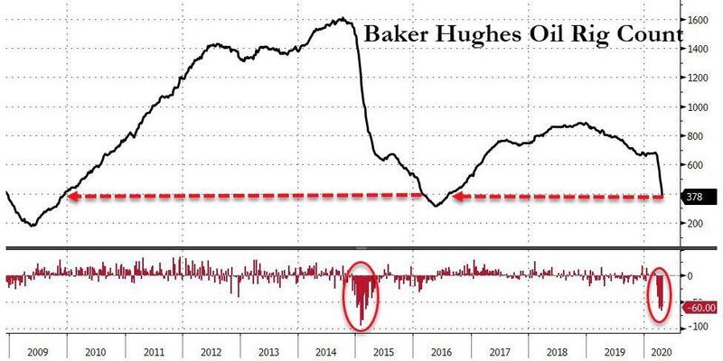 美国仍在运营当中的石油钻井平台数量正迅速下降,从公共卫生事件爆发之前的大约650个锐减至上周的378个,创出四年最低水平,关停数量超过四成。