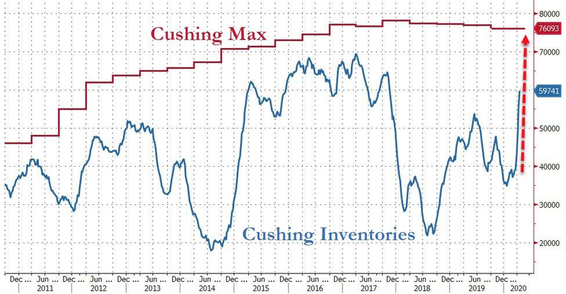 美国陆地原油运输枢纽、WTI原油期货交割地库欣的储油量已经相当于6000多万桶,在7600万桶的总库容中占比高达近80%。按照这速度,剩余储油空间三、四周内就会耗尽。