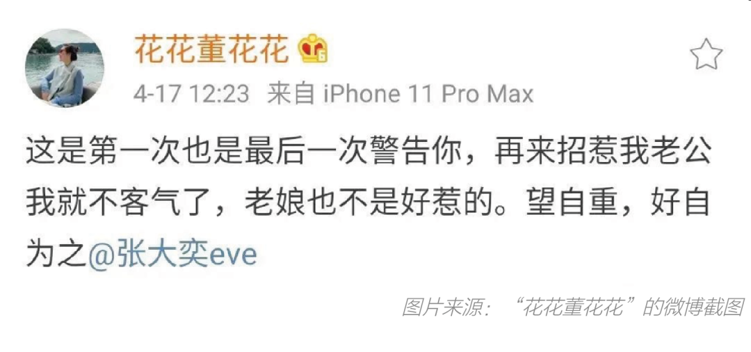 4月17日,微博ID为“花花董花花”的用户发布了一条微博,公开点名网红张大奕,并警告对方:“再来招惹我老公我就不客气了”。随后,有网友指出“花花董花花”是淘宝总裁兼天猫总裁蒋凡的妻子。