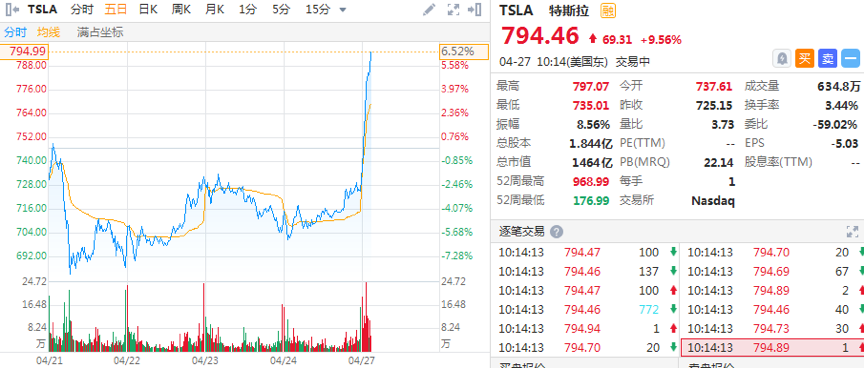 华盛资讯4月27日讯,特斯拉(TSLA)盘中大涨,目前正向800美元进发。截至发稿,特斯拉涨9.56%,现报794.46美元,当前总市值达1464亿美元。