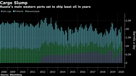这个全球最大的能源生产国下个月从其三个主要西部港口输送的乌拉尔原油将降至至少十年来的最低水平。在世界各地的石油生产商都因为价格暴跌而承受巨大压力之际,这三个港口(波罗的海的普里莫尔斯克和乌斯特卢迦以及黑海的新罗西斯克)的石油出口也在崩溃。俄罗斯还与包括沙特阿拉伯在内的其他产油国达成了一项协议,共同限制产量来缓解冠状病毒对石油需求的打击。