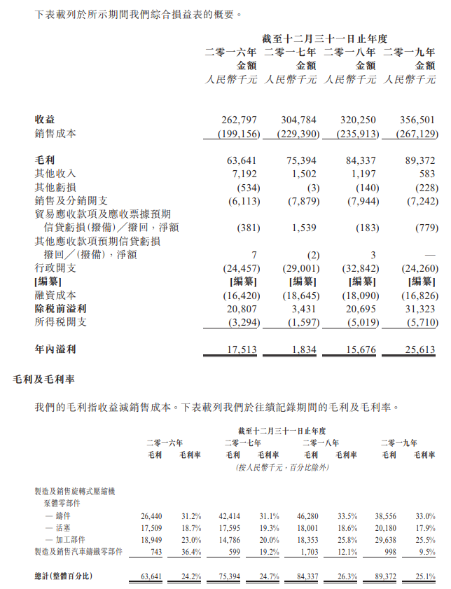 财务方面,该公司截至2016年、2017年、2018年及2019年12月31日止年度,收益分别约为2.62亿元、3.04亿元、3.20亿元、3.57亿元;毛利分别约为6364万元、7539万元、8433万元、8937万元,年内溢利分别为1751.3万元、183.4万元、 1567.6万元、 2561.3万元。毛利率分别为24.2%、24.7%、26.3%、25.1%,经调整后纯利率分别为7.5%、7.0%、6.7%、9.8%。