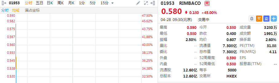 华盛资讯4月28日讯,马来西亚楼宇承包商Rimbaco Group今日正式挂牌港交所,开盘大涨58%,总市值7.308亿港元,不计手续费一手可赚900港元。