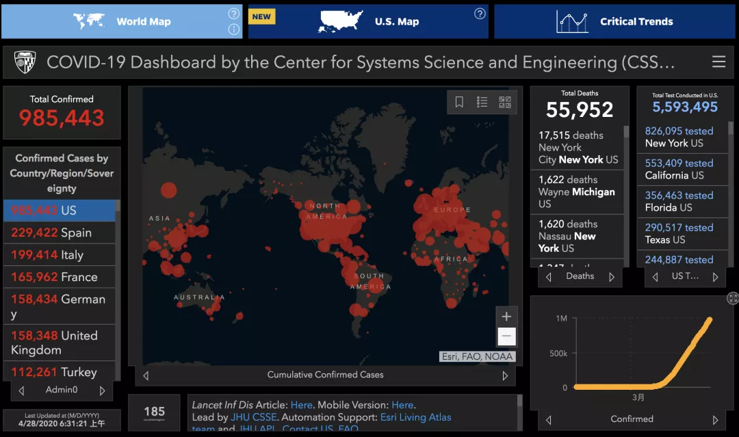 美国约翰斯·霍普金斯大学实时数据显示,截至北京时间4月28日6时30分左右,美国累计确诊逼近100万例,达985443例,死亡55952例。
