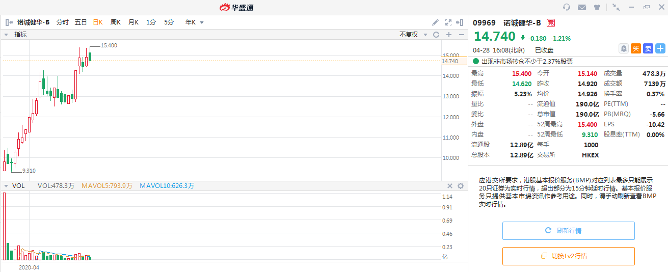 首先是由世界著名结构生物学家施一公教授和崔霁松博士联合创立的诺诚健华-B。诺诚健华在3月23日登陆港交所,发行价为8.95港元,截至4月28日收市,累计最大涨幅已经超过72%。
