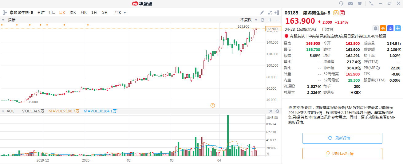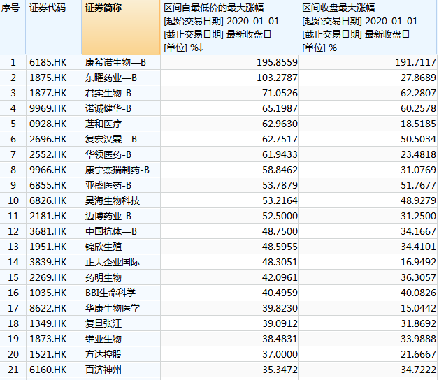 而说到截至4月28日,2020年以来生物制药涨幅之王却非上述两家,而是康希诺生物-B。康希诺生物在2020年4个月不到的时间,从最低55.5港元涨至最高165.9港元,区间最大涨幅超过198.9%,接近整整两倍!