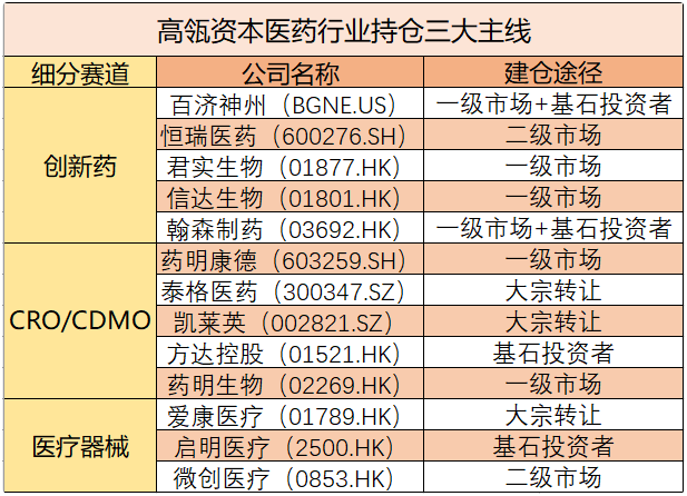 在创新药领域,除了百济神州,高瓴资本还完成了对恒瑞医药、君实生物、信达生物、翰森制药的布局,实现了国内PD-1抗肿瘤药龙头企业的全覆盖。此外在港股医疗器械板块,高瓴布局了爱康医疗、启明医疗、微创医疗,以及刚通过港交所聆讯专注心脏瓣膜器械的沛嘉医疗。