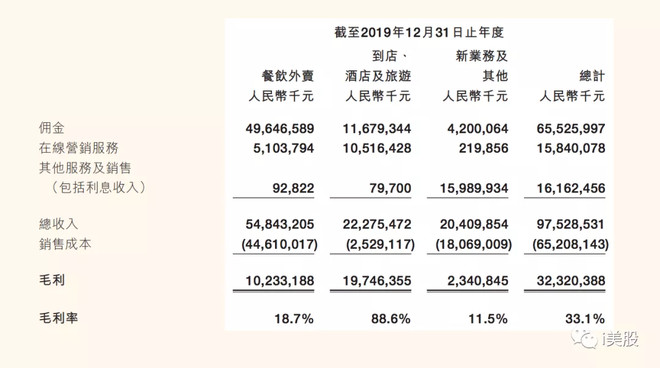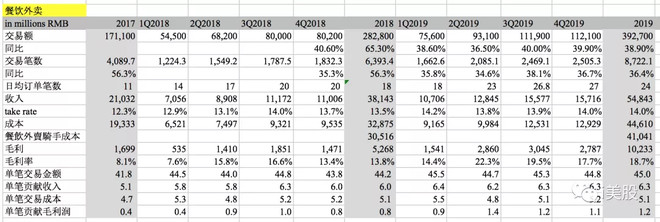 分摊到每笔订单中,2019、2018和2017年,平台为餐饮外卖每单支付的成本分别为5.1元、5.1元和4.7元;通过效率,平台实现每单毛利分别为0.4元、0.8元和1.2元。