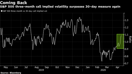 Susquehanna的衍生品策略师Chris Murphy表示,在经历至少一个月的价格倒挂后,一旦波动率曲线恢复上行陡峭的趋势,小型股未来一个月料将跑赢大盘。他建议看好未来几周小型股涨势的投资者买进iShares罗素2000交易所交易基金的5月133美元/138美元的看涨期权价差。