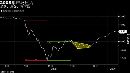 彭博金融状况指数包括九个指标,其中有Ted利差,市政债券与10年期美国国债利差,以及标普500指数的VIX波动率指数,分别与2008年9月雷曼兄弟破产之前的平均水平进行比较。