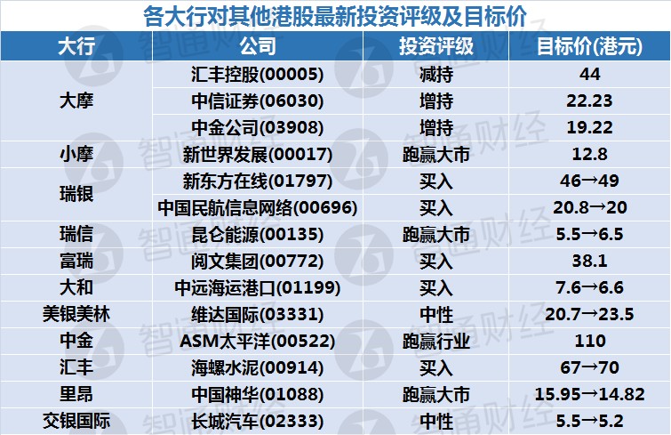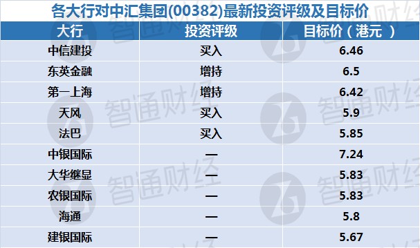 2、各大行对中汇集团(00382)最新投资评级及目标价