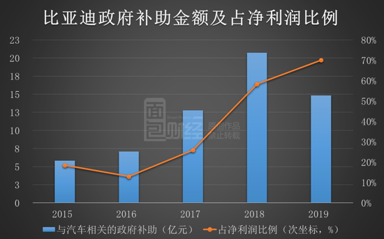 2019年,比亚迪净利润约21.19亿元,其中,与汽车相关并计入当期非经常性损益的政府补助金额约14.84亿元,政府补助在公司净利润中的占比约70.03%,系公司净利润的主要来源。