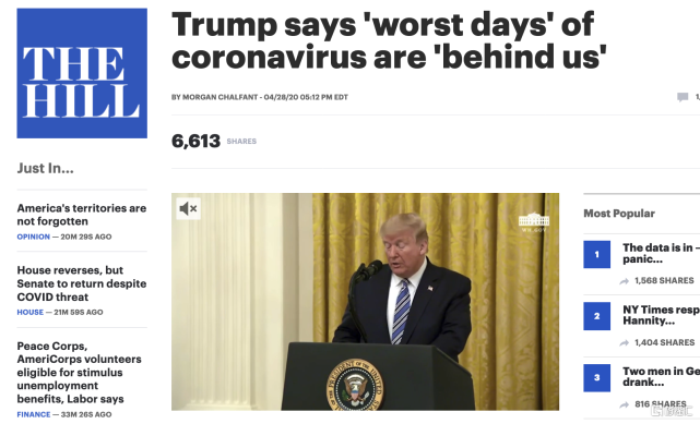 特朗普说,“现在,我们的专家相信,这场大流行最糟糕的日子已经过去,美国人民期待着我们国家安全且迅速地重新开放。”