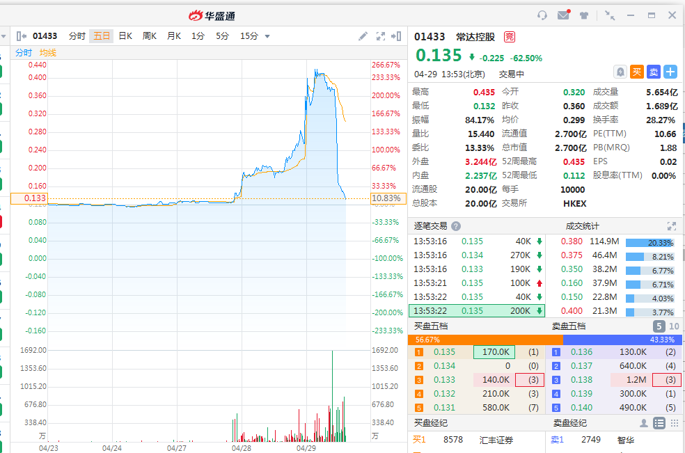 常达控股昨日暴涨129%,今早曾再升20.8%见0.435港元创新高,但好景不长,股价午后放量急挫。