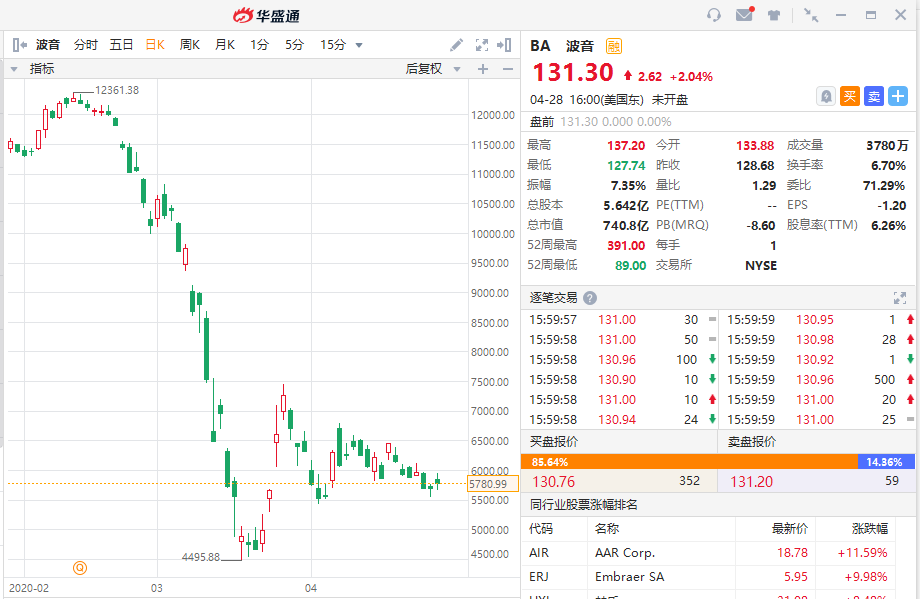 由于担心复苏过程的漫长而艰辛,华尔街的投资者已经开始抛售波音的股票。截至周二收盘,波音股价报131.30美元,今年以来已经跌近60%。是道指中表现最差的个股。
