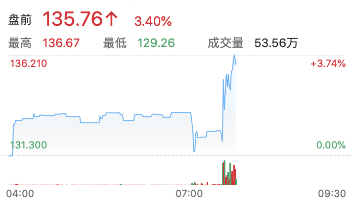 截至发稿,波音盘前涨3.40%,现报135.76美元美股。
