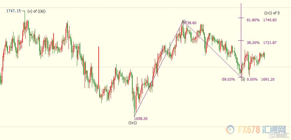 现货黄金可能已经从1691美元开启上行(iii)浪走势,上方目标位看到1722美元和1731美元,它们分别是(iii)浪的38.2%和50%目标位。(iii)浪是自1658美元开启的上行((v))浪的子浪。