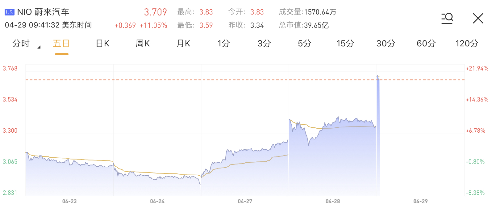 华盛资讯4月29日讯,蔚来汽车(NIO)高开,一度涨超13%。截至发稿,蔚来汽车大涨13.05%,报3.765美元每股,当前成交量1570.64万股,总市值突破40亿美元。