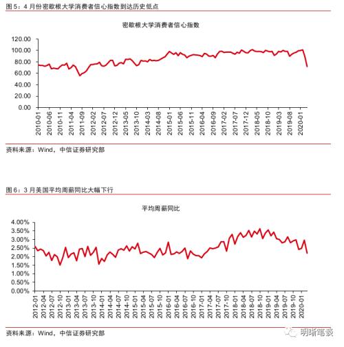 消费方面,零售销售数据大幅恶化,消费者信心指数大幅下滑,消费边际收缩。一季度实际个人消费支出初值环比减7.6%,预期减3.6%,前值增1.8%;实际个人消费支出差于预期值。3月美国零售和食品服务销售同比为-7.02%,自2009年以来首次转负,环比-8.7%,预期值-8%,前值-0.5%,弱于预期。3月零售数据大幅恶化显示出疫情的冲击。而消费者信心指数在3月和4月份也经历了连续的大幅下挫,密歇根大学消费者信心指数由2月的101点下滑至4月的71.8点。4月份公布的密歇根大学消费者信心指数为71.8,虽然略好于预期值68,但已经下滑至2011年6月以来的历史低点。平均薪资是影响消费的重要因素,平均薪资的增长增加居民收入,为消费的增长提供动力。4月3日美国劳工局公布的3月份美国私人非农企业平均周薪为978.80美元,自2019年4月以来首次下降,降幅达到2016年8月以来的最大值,同比增幅2.2%,创2017年2月以来新低。总的来说,平均周薪同比处于下行通道,3月的大幅下行也扭转了2月份的回升。整体来看,零售销售数据的恶化、消费者信心指数的大幅下行和平均周薪同比的下行反映了疫情对于居民消费的冲击。