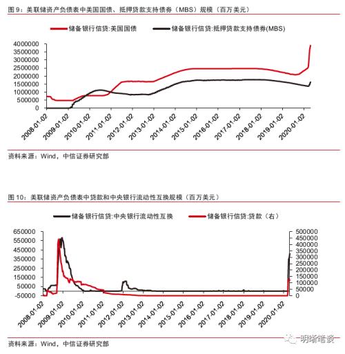资产购买种类方面,美国国债是美联储资产购买的主要项目,MBS和一级信贷规模也有大幅度的增加。近期美联储资产负债表中增长明显的分项包括美国国债、抵押贷款支持债券(MBS)、贷款、中央银行流动性互换。截至4月22日美国国债规模自3月11日的2.523万亿美元增至3.909万亿美元,日均增速一度达到724.9亿美元;MBS规模自3月11日的1.372万亿美元增至1.622万亿美元。贷款规模由3月11日的1.1千万美元大幅增长至1220.88亿美元,主要来源于一级贷款规模的扩大,而二级贷款和季节性贷款几乎无变动;中央银行流动性互换由3月11日的5.8亿美元增长至4097.12亿美元。从资产负债表的变动可以看出,国债是资产购买的最主要内容,MBS和通过贴现窗口向存款机构释放的一级信贷也有大幅度的增加。